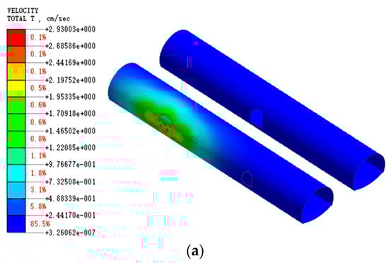 Figure 12 shows the numerical simulation results of particle vibration velocity for the secondary lining of the main tunnel under different working conditions. The maximum particle vibration velocities of the main tunnel’s secondary lining in working condition 1 and working condition 2 are 2.9 cm/s and 4.3 cm/s, respectively, both complying with relevant code requirements. However, the maximum particle vibration velocity in working condition 3 exceeds the limit specified in the code. Moreover, the influence range of blasting dynamic loads in working condition 2 is significantly smaller than that in working condition 1. Therefore, the influence range of connecting tunnel blasting excavation on the main tunnel is related not only to the maximum charge amount but also to the charge diameter and borehole diameter.