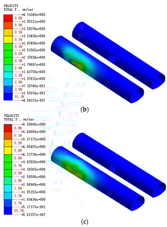 Particle vibration velocity of the secondary lining in the main tunnel under different working conditions: (a) working condition 1; (b) working condition 2; (c) working condition 3.