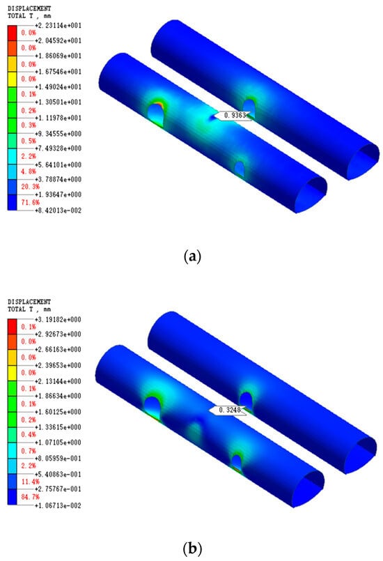 Figure 13a shows the numerical simulation of the secondary lining deformation of the main tunnel after the full-face construction of the overpass section of the connecting passage. At this point, the maximum deformation of the secondary lining at the position (on the top of the right tunnel) with the minimum clear distance from the connecting passage is approximately 0.9 mm, but the maximum cumulative deformation of the main tunnel’s secondary lining reaches about 15 mm. Therefore, the adoption of the full-face method for the overpass section of the connecting passage causes significant disturbance to the main tunnel.