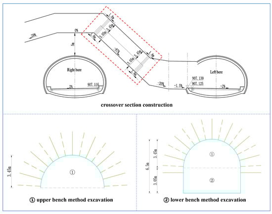 In summary, existing scholars’ research on the control of construction parameters for tunnels and connecting tunnels is relatively limited in scope. Meanwhile, there are few studies on the construction parameters of highway connecting tunnels [25,26,27], and the influence characteristics of connecting tunnel construction parameters on surrounding strata and existing structures have not been systematically analyzed. Relevant research results and conclusions have limited guiding significance for construction projects involving complex connecting tunnels in extra-long highway tunnels. Based on existing research, this paper investigates the impact of different construction parameter controls on existing main tunnels during the construction of connecting tunnels through methods such as on-site monitoring and numerical simulation. It conducts in-depth analysis on the excavation step and blasting parameters of connecting tunnels, optimizes construction excavation methods and schemes, and thus achieves the safe and efficient construction of connecting tunnels between extra-long highway tunnels and complex air shaft systems.