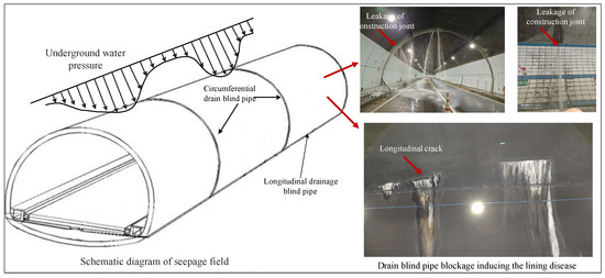 During the operation period, the drainage system of highway tunnels is prone to clogging, mainly due to the crystallization and hardening of calcium carbonate deposits, as well as the infiltration of particles such as silt and gravel carried by groundwater flow. Once the tunnel drainage system becomes blocked, groundwater cannot be discharged promptly, leading to increased water pressure behind the tunnel lining. In the areas between adjacent circumferential pipes, pore water accumulates, resulting in the highest seepage pressure [34]. As groundwater pressure continues to rise, it may cause leakage or even cracking of the lining structure, as illustrated in Figure 2.