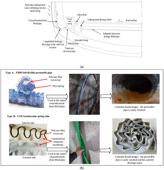 The drainage system in mountain tunnel linings typically serves as the primary barrier for groundwater discharge. This system comprises circumferential drainage blind pipes, longitudinal drainage blind pipes, and transverse diversion pipes. Among them, the circumferential drainage pipe plays a critical role in guiding seepage water and effectively reducing groundwater pressure behind the lining. In engineering practice, the spacing, diameter, and permeability of circumferential drainage blind pipes directly influence the efficiency of the tunnel lining drainage system. However, traditional circumferential drainage pipes are often prone to clogging, material aging, or construction deviations, all of which reduce drainage efficiency and lead to groundwater pressure buildup behind the lining [18,19,20]. Huang et al. [21] pointed out that quality control during tunnel drainage pipe construction lacks standardized procedures, and that pipe selection is largely based on experience. They emphasized that both drainage pipe materials and construction techniques need to be optimized. Tan et al. [22] reported quality issues in railway tunnel construction, where longitudinal drainage pipes suffered from severe deformation and damage. Although the existing studies [23] have acknowledged the problems of clogging—especially those related to crystallization and pipe diameter reduction in tunnel lining drainage systems—most research still focuses on performance degradation due to internal crystallization and its effects on the structural safety of tunnel linings. To enhance the drainage capacity of tunnel linings, Fu et al. [24] developed a refined calculation model for tunnel drainage systems considering the spacing parameters of circumferential blind pipes. In France, the ULTI-FLOW drainage system, composed of stacked corrugated polyethylene pipes wrapped with polypropylene geotextiles, has been applied [25]. Double-wall corrugated pipe [26], drainage mat and blind ditch materials [27] have also been developed and used in geotechnical engineering. Additionally, capillary permeable drainage belts have been introduced as a novel drainage material [28]. These products actively remove seepage water and exhibit superior drainage performance compared to traditional sand-gravel filter layers and geotextiles. Nevertheless, research and practical applications of new drainage blind pipe materials in tunnel engineering remain limited.