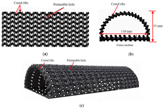 To overcome the limitations of existing circumferential drainage blind pipes in terms of permeability, deformation resistance, and anti-clogging performance, a new type of pipe was developed based on the mesh structure of rigid plastic permeable pipes (see Figure 4). This new design features a semicircular profile with a maximum thickness of 55 mm, aligning with the dimensional specifications of conventional drainage pipes. It incorporates a reticular (mesh-like) permeable structure on both the circumferential surface and bottom face. The circumferential and bottom components are integrally connected by a series of corrugated ribs. The bottom structure consists of two stacked layers of ribs, enabling a uniform distribution of water-permeable openings across the entire pipe surface. Accordingly, the pipe was designated as the Corrugated Reticular Circumferential Drainage Blind Pipe.