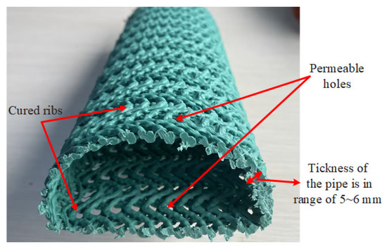 Based on these requirements and the comparative properties listed in Table 1, HDPE and PP were found to meet the necessary performance criteria. Other materials lacked sufficient flexibility. Considering additional factors such as cost and manufacturability, high-density polyethylene (HDPE) was ultimately chosen as the raw material for producing the new circumferential drainage blind pipe. To enhance the pipe’s long-term durability, additives such as antioxidants, anti-corrosion agents (for acid and alkali resistance), and toughening agents were incorporated [38]. The thermoplastic resin content in the HDPE used for the fabrication of the pipe exceeded 80%. Based on the design parameters such as wall thickness and pore size (as detailed in Section 4), the test samples were produced using high-temperature extrusion in a single-step forming process. The resulting new reticular permeable drainage pipe is shown in Figure 4. The pipe featured uniformly distributed water-permeable holes, and the thickness of the corrugated ribs was 3 mm, resulting in a total wall thickness of 6 mm.
