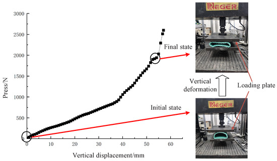The ring bearing capacity of the new reticular circumferential drainage blind pipe was primarily determined by its wall thickness. This capacity was evaluated by applying a vertical load to the pipe sample. As shown in Figure 7, the bearing capacity was measured using a ring stiffness testing machine. The test sample had a length of 30 cm and a wall thickness of 4 mm, and loading was performed in accordance with the relevant testing standards [45]. According to the test results in Figure 7, when the vertical displacement of the sample was less than 37 mm, the relationship between vertical load and displacement was approximately linear. When the vertical displacement exceeded 37 mm, the semicircular shape of the pipe began to flatten, and the vertical load continued to increase with deformation until the pipe was fully compressed. A bilinear trend was observed between vertical load and displacement, indicating the presence of an inflection point in the bearing behavior. At this inflection point, the pipe structure was essentially flattened, and its internal permeable space had significantly decreased. The load value at this stage can be considered the ultimate ring bearing capacity of the new circumferential drainage pipe. Therefore, when the pipe wall thickness was 4 mm, the ultimate ring bearing capacity was measured to be 0.86 kN.