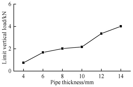 The relationship between the circumferential bearing capacity and the wall thickness of the new circumferential drainage pipe is shown in Figure 8. As observed from the results in Figure 8, when the wall thickness of the new pipe was 6 mm, 8 mm, and 10 mm, the corresponding circumferential bearing capacities were 1.87 kN, 2.05 kN, and 2.17 kN, respectively. Compared to the pipe with a wall thickness of 4 mm, the circumferential bearing capacity was significantly enhanced.