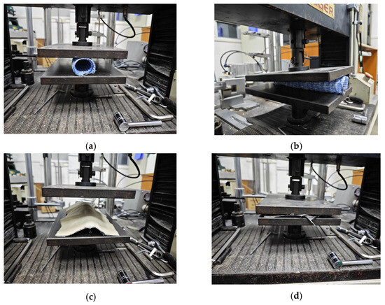 Bearing capacity test for the traditional circumferential blind pipe: (a) before vertical loading test of the FH50 pipe (not cut); (b) after vertical loading test of the FH50 pipe; (c) before vertical loading test of the F110 pipe; (d) after vertical loading test of the F110 pipe.