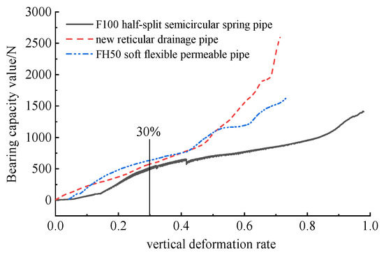 As shown in Figure 9, the circumferential bearing capacity of the new blind pipe with a wall thickness of 6 mm was tested, along with the traditional types of circumferential blind pipes (i.e., FH50 soft flexible permeable pipe and F110 semicircular spring pipe). In the circumferential bearing capacity test illustrated in Figure 9, the height of the F110 semicircular spring pipe was 30 cm, the height of the FH50 soft flexible permeable pipe was 50 mm, and the height of the new reticular permeable drainage pipe was 57 mm. Considering that all three circumferential blind pipes had a circular shape, for ease of comparison, the vertical deformation rate of each pipe was defined as the ratio of the maximum vertical deformation to the specimen height. When the vertical deformation rate reached 30%, the corresponding vertical load was defined as the circumferential bearing value of the pipe. The vertical deformation rate was calculated using the following equation [44]: