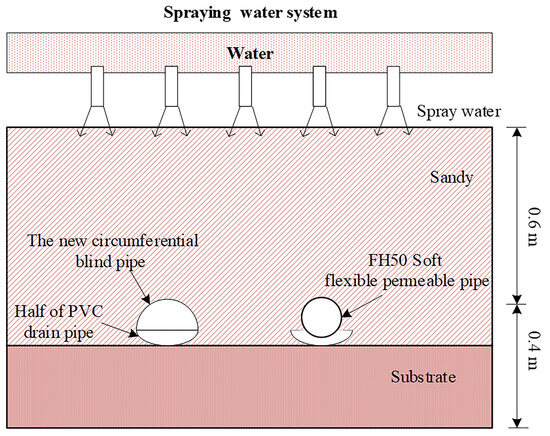 For this test, each pipe specimen had a length of 1.0 m, and a 2% unidirectional slope was applied along the vertical thickness direction. A semi-open PVC drainage pipe was installed beneath both the new reticular circumferential drainage blind pipe and the FH50 pipe to facilitate water discharge. A sprinkler system installed above the sand layer simulated groundwater flow, delivering water at a constant rate of 20 L/day.