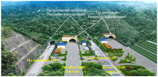 The G4 Expressway is a major transportation corridor connecting Beijing, Hong Kong, and Macau, spanning the entire length of China from north to south. In Guangdong Province, the G4 Expressway has been undergoing reconstruction and expansion due to its heavy traffic volume. The reconstruction and expansion project for the Guangzhou–Qingyuan section of the Beijing–Hong Kong–Macau Expressway (G4) commenced in 2025. Within this section, the existing Dan-Jia-Shao Tunnel was a twin-bore highway tunnel, each bore accommodating six lanes, with a total tunnel length of 807 m. Located in Qingyuan City, the Dan-Jia-Shao Tunnel serves as a key passage to Guangzhou. During the expansion, the route was upgraded to a twin-bore twelve-lane highway tunnel. As shown in Figure 14, the expansion plan involved the construction of two additional single-bore tunnels. One new tunnel (Left line) was built between the two existing bores, while the other was constructed on the west side. The distance between the newly constructed left-line tunnel and the existing left/right tunnels was approximately 25 m.