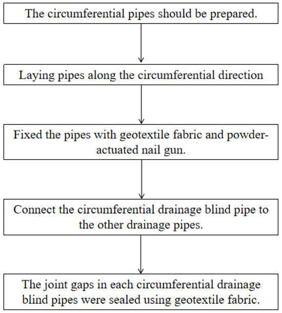 Based on the structural characteristics of the new type of reticular circumferential drainage blind pipe, as can be seen in Figure 15, a finalized installation procedure was developed as follows: