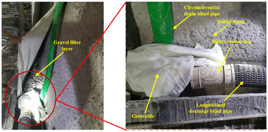 When FH50 soft flexible permeable pipes and F110 semicircular spring tubes are used as circumferential drainage blind pipes behind the tunnel’s secondary lining, the issue of overlapping with longitudinal drainage pipes has long been overlooked—typically, joints were stacked with gravel only, as shown in Figure 17 and Figure 18. These pipes were commonly connected either by loosely placing crushed stones at the interface or by directly inserting the circumferential pipe into the longitudinal drainage pipe. Such connection methods hindered inspection and maintenance during tunnel operation.