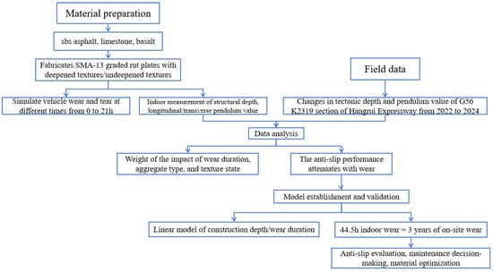 This study employs a combined approach of laboratory tests and field measurements to systematically investigate the evolution laws of anti-skid and wear-resistant performance for in-service asphalt pavements. SBS modified asphalt and two aggregate types (limestone and basalt) were used to prepare mixture specimens, which underwent accelerated wear tests with and without deepened-texture treatments. The structural depth and friction coefficients at different wear stages were measured to analyze the decay trends and predict the anti-skid performance of deepened-texture asphalt concrete surfaces. The study further evaluates the improvement effects of deepened-texture technology and the influence of aggregate types on anti-skid performance. Field detection data from the G56 K2319 section of the Hangrui Expressway were used to explore anti-skid performance variations at different service stages, which were compared with laboratory test results to validate the simulation accuracy of accelerated wear tests. These findings provide theoretical and data-driven support for anti-skid performance evaluation methods, guiding maintenance decision-making and performance optimization of asphalt pavements. The full flow chat of this paper was shown in Figure 1.