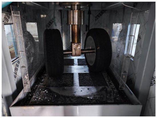 In this study, indoor accelerated wear equipment was used to conduct accelerated wear tests to simulate the wear of pavements caused by vehicles, as shown in Figure 3. The indoor accelerated wear test used a self-developed dual-wheel polishing device (Model: HW-ASP-Ⅱ). Two parallel rubber tires (size: 205/55 R16, tread pattern depth: 8 mm, rubber hardness: 65 Shore A) were arranged symmetrically, with an axle distance of 200 mm. The tire material mimics the friction characteristics of passenger car tires in actual traffic. A pneumatic loading device applies vertical pressure to the tires, adjustable in the range of 0–0.5 MPa. In this study, the contact pressure between the tires and the specimen surface was set to 0.3 MPa via pressure gauge calibration. A variable-frequency motor (power: 1.5 kW) drives the tires to rotate at a controllable speed (50–300 r/min). The rotational speed was fixed at 120 r/min, with the direction of rotation consistent with the longitudinal direction of the rutting plate specimen (300 × 300 × 50 mm3). An environmental chamber encloses the test area, maintaining the temperature at 20 ± 1 °C through a refrigeration/heating module, with real-time temperature monitoring via a thermocouple embedded 5 mm below the specimen surface. A stainless-steel fixture clamps the rutting plate specimen to prevent displacement during wear, ensuring uniform contact between the tires and the specimen surface. The test adopted dual-tire wear with a wheel ground contact pressure of 0.3 MPa, a rotational speed of 120 r/min, and a temperature control of 20 °C. These parameters are consistent with the common tire specifications in actual road traffic, ensuring that the simulated wear effect is more representative of real-world conditions. The wear durations were set as 0 h, 1 h, 3 h, 7 h, 13 h, 19 h, and 21 h so as to better analyze the decay law of the anti-skid performance of the mixture surface and simulate the actual decay of the asphalt concrete surface course.