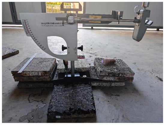 The surface texture depth (TD) of rutting plate specimens was measured by the sand patch method, and the surface friction pendulum values in different directions (longitudinal and transverse) were measured by the pendulum friction test, which were used as the evaluation indices for the surface anti-skid performance of the deepened-texture pavement. The sand patch method for measuring structural depth (TD) followed the specifications of JTG E60-2008 [39] (Standard Test Methods of Bituminous Mixtures for Highway Engineering) with the following detailed steps: Dry the surface of the rutting plate specimen (300 × 300 × 50 mm3) with a hair dryer to remove loose particles. Prepare standard sand (silica sand with particle size 0.15–0.3 mm, bulk density: 1.5 g/cm3) and sieve it to remove impurities. Use a 50 mL graduated cylinder to measure 25 mL of standard sand (mass: ~37.5 g). Place the specimen on a horizontal platform. Hold the graduated cylinder vertically, and slowly pour the 25 mL standard sand onto the center of the specimen surface. Use a flat scraper (stainless steel, 150 × 50 mm2) to gently spread the sand outward in a circular motion, ensuring the sand fills the surface texture without compacting or lifting. Continue spreading until the sand forms a uniform, contiguous patch with no visible gaps. Use a Vernier caliper (accuracy: 0.01 mm) to measure the diameter of the sand patch at 4 orthogonal directions (e.g., 0°, 90°, 45°, 135°). Repeat the test 3 times at different positions on the specimen surface, and take the average value as the final structural depth.