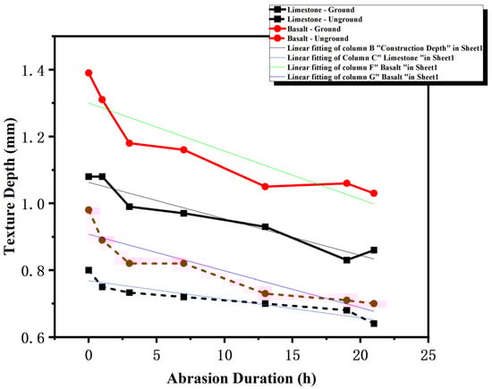After deepened-texture treatment, the structural depths of both mixtures increase significantly. The initial structural depth of deepened basalt mixtures reaches 1.20 mm and that of limestone mixtures reaches 1.06 mm. Throughout the wear process, basalt mixtures maintain a higher structural depth. For instance, after 13 h of wear, the structural depth of deepened basalt mixtures is approximately 1.07 mm, compared to 0.93 mm for deepened limestone mixtures. This fully demonstrates that deepened-texture technology effectively enhances the structural depth of mixture surfaces, retards performance decay during wear and further confirms that basalt mixtures have superior wear resistance over limestone mixtures.