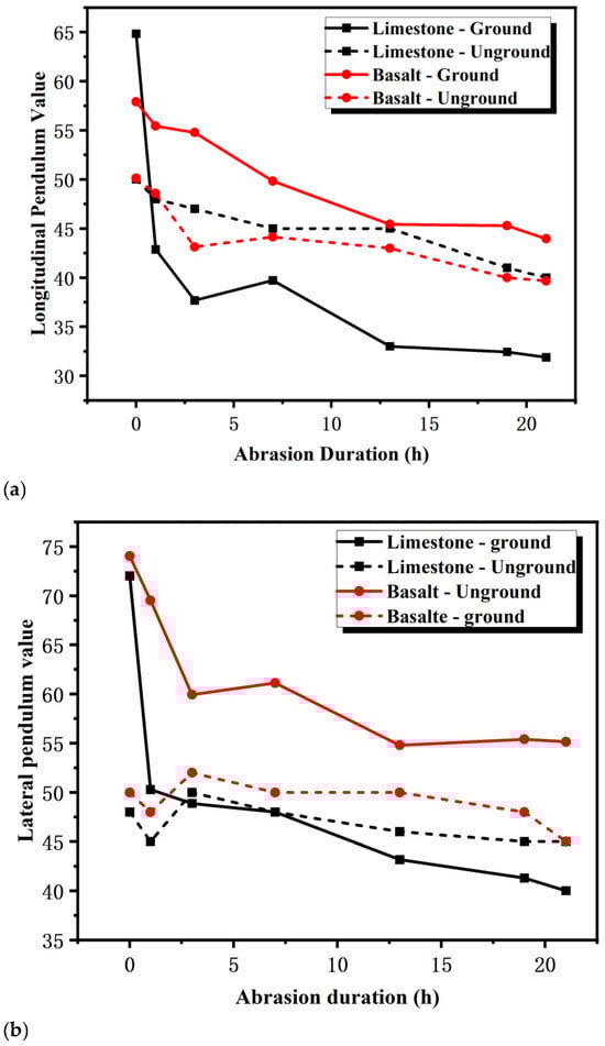 The longitudinal and transverse pendulum values of both mixtures remain at low levels initially, decreasing slightly but steadily with increasing wear duration. Specifically, basalt mixtures show higher longitudinal pendulum values than limestone mixtures, while limestone mixtures exhibit higher transverse pendulum values. For example, at 0 h of wear, the longitudinal pendulum value of basalt mixtures is approximately 44, compared to 40 for limestone; the transverse pendulum value is approximately 50 for limestone and 48 for basalt. This indicates that basalt is more conducive to longitudinal anti-skid, while limestone has certain advantages in transverse anti-skid performance without deepened texture.