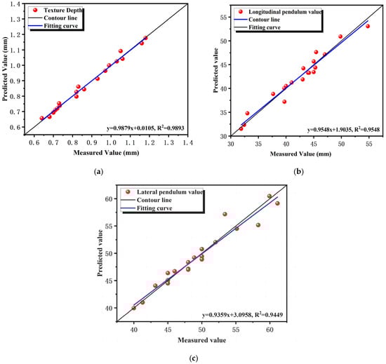 The comparison results between the predicted values and measured values of structural depth and pendulum values in Figure 8 fully prove that the linear fitting model can effectively describe the variation laws of structural depth and pendulum values with wear duration (x). Whether it is structural depth or longitudinal and transverse pendulum values, the model can accurately predict the numerical changes under the conditions of the indoor accelerated wear test to a high degree, providing a reliable basis for in-depth study of the decay law of anti-skid performance, and has important engineering significance for optimizing pavement design and reasonably formulating maintenance strategies.