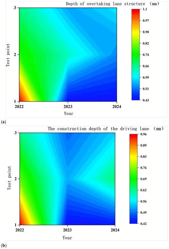 Figure 9 illustrates the annual structural depth changes in different lanes in the G56 K2319 section of the Hangrui Expressway from 2022 to 2024, clearly showing multi-faceted characteristics in data variations. The structural depths of the surface courses in the overtaking lane and driving lane generally exhibited a downward trend during 2022–2024. In 2022, the structural depths of the surface courses in both lanes were relatively high, with the maximum value of approximately 1.05 mm in the overtaking lane and 0.96 mm in the driving lane, showing similar distribution characteristics due to consistent initial pavement conditions. By 2023, the structural depth at each test point had decreased, and the differences in structural depth between lanes expanded. For example, the structural depth of test point 1 in the overtaking lane decreased from approximately 0.97 mm in 2022 to 0.66 mm in 2023, and that of test point 1 in the driving lane decreased from 0.89 mm to 0.62 mm, indicating that factors such as vehicle loads, driving paths, and speeds gradually influenced the wear of the surface course. By 2024, the decline in structural depth tended to flatten, and slight rebounds were observed in the structural depth of overtaking-lane test point 3, as well as driving-lane test points 2 and 3. The structural depth of overtaking-lane test point 3 rebounded from approximately 0.51 mm in 2023 to 0.59 mm in 2024, and that of driving-lane test point 2 rebounded from 0.49 mm to 0.56 mm, suggesting that surface course wear gradually reached a stable state. In local areas, the structural depth may have recovered due to reduced wear rates or extrusion from vehicle loads.