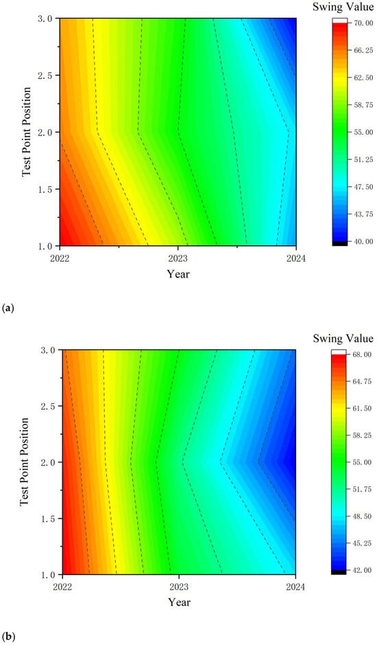 Figure 10 presents the annual pendulum value changes of different lanes in the G56 K2319 section of the Hangrui Expressway from 2022 to 2024, containing rich information that reflects the variation characteristics of pavement anti-skid performance across different lanes and time dimensions.