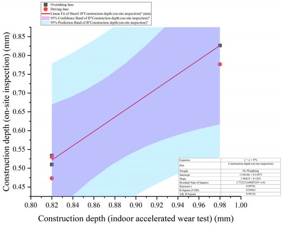 Although there are certain differences in structural depth between field detection and indoor accelerated wear tests, the two still exhibit a good linear relationship. It can be seen from the figure that the fitting curves of both the overtaking lane and driving lane have high correlation coefficients, indicating that the indoor accelerated wear test can simulate the variation trend of structural depth of actual pavements with time to a certain extent. After three years of operational wear, the average structural depths of the driving lane and overtaking lane measured on site are 0.53 mm and 0.51 mm, respectively. Using the fitting formula of indoor wear time and structural depth (Formula (1)), it is calculated that the average structural depth (0.52 mm) of the measured pavement after three years of operational wear roughly corresponds to the wear effect of asphalt pavement surfaces under 44.5 h of indoor accelerated wear. This indicates that the indoor accelerated wear test has a certain accuracy in predicting the wear condition of actual pavements and can provide a reference for evaluating the anti-skid performance of actual pavements in different service years. The correlation between indoor accelerated wear test data and field detection data provides convenience for researchers and road managers. Through indoor accelerated wear tests, structural depth data under different wear durations can be obtained in a relatively short time, thereby predicting the change in anti-skid performance of actual pavements during long-term use, which helps to formulate reasonable pavement maintenance plans in advance and improve road safety and durability.
