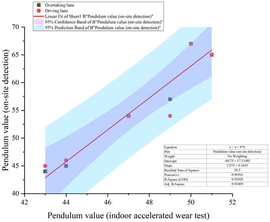 The data variation characteristics in Figure 12 not only confirm the linear relationship between on-site and indoor swing data but also provide an effective method for predicting road anti-skid performance. By conducting indoor accelerated wear tests, it is possible to simulate wear conditions of different durations in a laboratory environment. Combined with on-site data fitting analysis, it is possible to more accurately grasp the changes in road anti-skid performance over time. This has important guiding significance for formulating road maintenance plans in advance, arranging maintenance measures reasonably, and ensuring road driving safety, which helps to improve the scientificity and economy of road maintenance.
