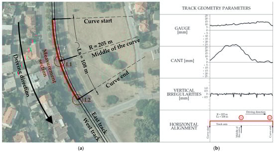 The measurement section is a 108 m long horizontal curve with a radius of R = 205 m. The first location (L1) of the measurement section is located in the middle of the curve, while the second location (L2) is located at the end of the curve (Figure 3a), and the track geometry characteristics for the measurement track segment (Ls = 108 m) are shown in Figure 3b.