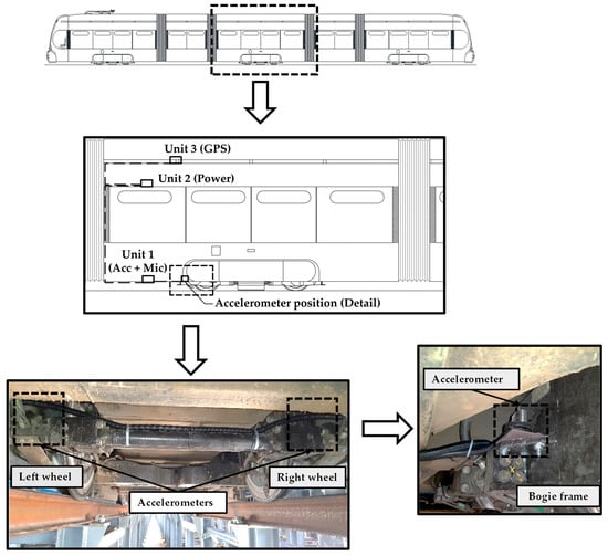 The vehicle was instrumented with a measurement system that consisted of three units: Unit 1—acceleration data acquisition, mounted on the bottom side of the tram chassis together with two accelerometers (Acc.) and a microphone (Mic.), mounted on a bogie frame, as close as possible to the wheel to get the most reliable data; Unit 2—power supply, connected to the tram power supply and mounted inside the tram passenger compartment, including battery backup designed to overcome short power drops during tram operation; and Unit 3—communication and positioning, mounted atop the tram chassis to acquire GNSS data and communicate with a remote cloud for data collecting and storage.
