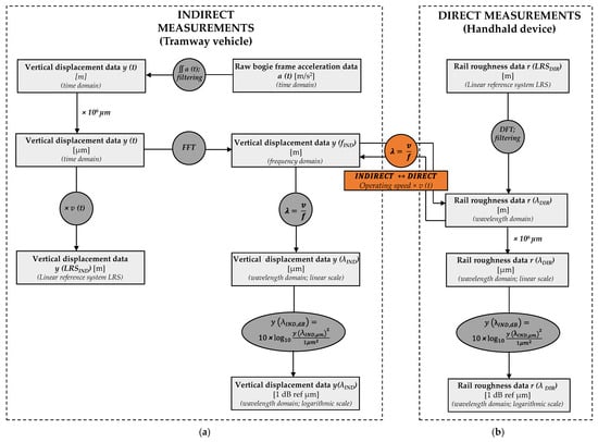 Indirect (a) and direct data processing flowchart (b); ∫∫ a (t) represents the operation of double integer of acceleration; × v (t) represents the transformation from time domain into spatial domain (LRS); FFT represents Fast Fourier transformation; DFT represents Discrete Fourier transformation; Equation λ = v/f represents speed dependency between different frequencies and wavelengths, allowing data to be transformed from frequency to wavelength domain and vice versa. Datasets that are being transformed this way are highlighted in orange brackets: (1) vertical displacement data in frequency domain y (fIND) and (2) rail roughness data in wavelength domain r (λDIR).