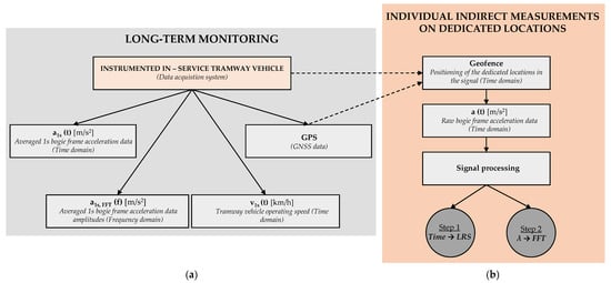 Bogie frame acceleration data acquisition for long-term monitoring (a) and individual indirect measurements using instrumented in-service tramway vehicle (b).