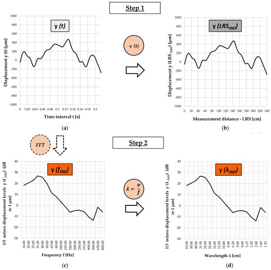 Acquired data was then processed following two steps using the tramway operating speed: Step 1: Displacement data conversion from time (t) to spatial domain (linear reference system—LRS), and analogously. Step 2: Transfer from frequency (f) to wavelength (λ) domain (Figure 9).