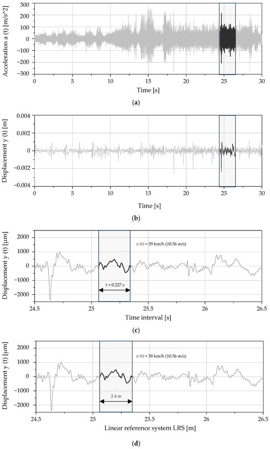 In Step 1, double integration was performed on the raw bogie acceleration signal to get vertical displacement data in the time domain. The double integration of raw acceleration data processing was chosen because it gives the vertical displacement data as a result, which can be directly compared with the directly measured data from the rail running surface. The vertical displacement data represents the vertical movement of the accelerometer on the bogie frame, which is a direct consequence to the wheel–rail contact. After integration, displacement data y (t) was converted from the time domain—time interval t [s] into the LRS—measurement distance [cm].