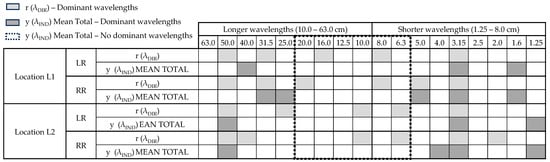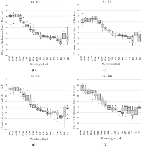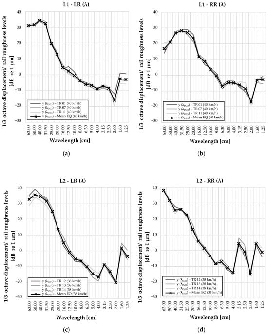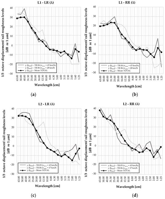 For various speeds, the displacement spectrum shifts along the frequency axis as a function of frequency. The displacement frequency spectrum has been transformed into a wavelength spectrum (LRtot (λ)) using (1). Typically, the wavelengths λ generated through this transformation won’t coincide with common wavelengths λC. The mentioned transformation (from frequency to wavelength domain) was made according to the CEN/TR 16891 technical report [45,47], and EN 15610 standard [11], closely dependent on the different operating speeds of the tram.
