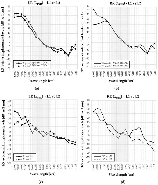 - There was a good coincidence of both vertical displacement data y (λIND) Mean TOTAL and rail roughness data r (λDIR) showed similar wave shapes observed in the spatial domain (LRS) and corresponding dominant wavelengths in the wavelength domain (λ). However, there were some differences, especially in the 6.3 cm < λ < 20 cm range, highlighting the complex interaction between wheel–rail contact dynamics and vehicle vibroacoustic properties.