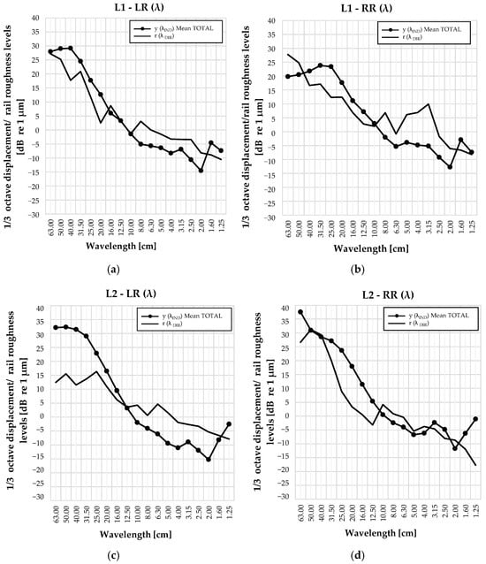 Rail roughness r (x) is measured as a variation in the height of the running surface expressed as a function of distance x along the running surface (spatial domain) (Figure 11a). To compare directly measured rail roughness data to indirectly obtained data from the tramway vehicle, the amplitude of the roughness data, (λ), was expressed as a function of the wavelength λ (Figure 11b). Directly measured rail roughness data r (x) was transferred from LRS to (λDIR) (Figure 11b), allowing for comparison with vertical displacement data y (λIND) and validation of the indirect measurements.