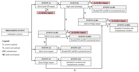 In this study, an earthquake in a seismically vulnerable cross-border area was considered a triggering event. Following such an event, the assumed event tree could branch like this: Firstly, the triggering event might have no impact on the HPP, and a corresponding branch would end quickly (see Event A1, option N). Alternatively, a case of a significant impact would lead to high water discharges (Event B) caused by a malfunction of the HPP gates. In the next step, the branch could end with no further impact or continue with flooding in the cross-border area unprotected by the levees (Events A1–B1). The triggering event could affect the levee network (Event A2) and the bridges (Event A3), which serve as critical nodes of the evacuation routes. If there is a direct impact that results in the serviceability or carrying capacity being exceeded, this leads to flooding of the area protected by the levees (Event A21) and disruption of the evacuation routes (Event A31). However, if there is no direct impact that leads to the limit states being exceeded, levees and bridges are still affected to some extent by ground shaking. They are, therefore, more vulnerable to an increase in hydrodynamic loads caused by flood discharges from HPP (Event B). Levees that are now under the indirect seismic influence of flood discharges can either be damaged or fail, leading to flooding of the area protected by the levees (Events A2–B11), or the diversion can end with no further impact. Similarly, with bridges, the additional flood events may cause the limit states to be exceeded, interrupting the evacuation routes (Events A3–B11). These scenarios highlight the complex interplay between different infrastructure systems and the potential for a single triggering event to cause a series of cascading consequences across the region.