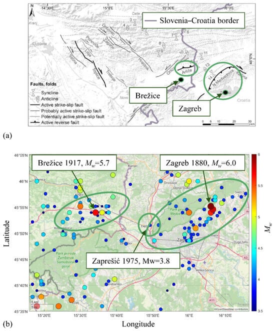 (a) Mapping of fault systems in the case study region (adapted after [28]); (b) distribution of earthquake epicentres and magnitudes in the study area, derived from the Slovenian earthquake catalogue (up to 2004) and the ESHM20 catalogue for 2005–2018 [29], showing key events such as 1917 Brežice, 1880 Zagreb and 1975 Zapresić earthquake (adapted after [27]).