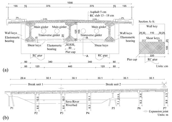 Shear keys restrain the transverse displacement of the deck at the pier caps, ensuring the deck remains stable under transverse loads. Four shear keys are located between the girders, while additional taller (wall) keys are constructed at both ends of the pier caps (Figure 8a). The substructure of the bridge is supported by 11 piers and two abutments. The intermediate piers are composed of circular column pairs of diameter 1.2 m, which are spaced 5.6 m apart, while piers 5 and 9 feature transverse RC walls. The circular columns are supported by bored piles of the same diameter, while the wall piers rest on top of a 1.5 m depth foundation mat and six inclined piles with diameters of 1.00 m. The bridge is divided into four independent brake units, each separated by expansion joints. The first two break units, i.e., the first half of the bridge, are presented in Figure 8b. The outer spans are 29.4 m each, while the remaining spans measure 30.1 m. Fixed bearings support main girders at piers P1 and P5, while elastomeric bearings are installed at the remaining piers. The cast-in-place slab ensures deck continuity over intermediate piers within each break unit. At the expansion joints, the deck is free to translate longitudinally and rotate about transverse and vertical axes.