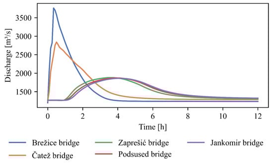 The resulting peak discharge reached approximately 4100 m3/s, exceeding the flow associated with a 100-year return period flood event. The rapid release of water from the reservoir resulted in a hydrograph with a steeply rising limb, which emptied the reservoir in 1.5 to 2 h. However, as the wave propagated downstream, the extensive floodplains between Brežice and Zagreb helped dissipate the energy, causing a gradual attenuation of the flood wave hydrograph. In Zagreb, the peak discharge of the flood wave did not exceed 2000 m3/s, corresponding to a flood event with a return period of 2 to 5 years.