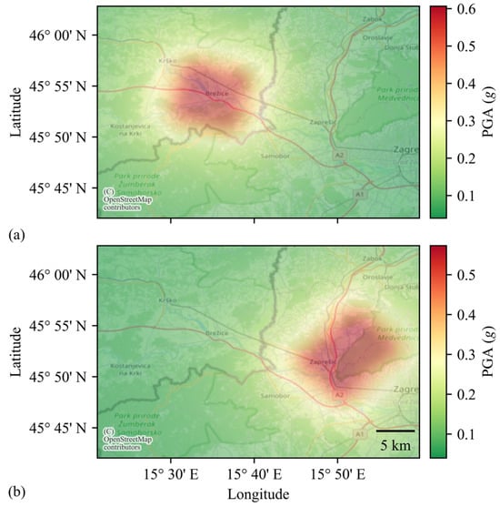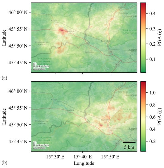 PGA fields for a distinct simulation: (a) Slovenian seismic scenario; (b) Croatian seismic scenario [42].