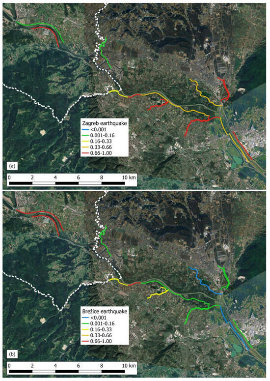 For this analysis, scenarios were modelled by adjusting the epicentres and considering conditions likely to produce significant cross-border impacts, allowing for a thorough evaluation of potential impact on the infrastructure. Selecting representative seismic scenarios was challenging due to numerous potential sources. Ideally, several scenarios should be analysed to identify the most severe events. However, for practical purposes and to facilitate future vulnerability analysis, it was decided to focus on replicating the two most significant historical events mentioned above. The exception is that the epicentre of the 1880 Zagreb earthquake was adjusted to the westernmost known reach of the North Medvenica fault, near the epicentre of the 1975 Zaprešić event, which was expected to provide larger cross-border impacts than the original event. The two seismic scenarios were quantified by modelling ground motion (GM) fields employing advanced numerical simulations using a ground-motion prediction equation (GMPE) [30,31], combined with stochastic methods. This approach enabled the generation of detailed spatial distributions of peak ground acceleration (PGA) on a rock across the study area, with a grid resolution of 0.5 km2.