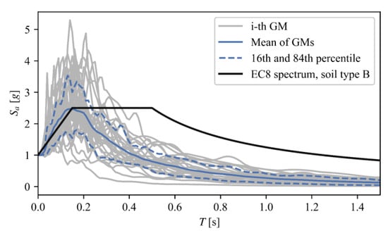 The described analysis can be implemented in conventional seismic vulnerability analysis methods, such as Incremental Dynamic Analysis (IDA) [35] or Multiple Stripe Analysis (MSA) [36]. The present research adopted the methodology previously employed in [37], which combined the techniques as mentioned above. Namely, the analysis was performed at predefined intensity levels; however, unlike MSA, which utilises different GM sets at different intensities, a single set of GMs was used for all intensity levels. While consistent with IDA in that it scales GMs to assess seismic response, it avoids estimating the intensity levels for specific damage states, reducing the required number of analyses.