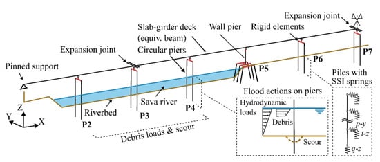 - Kosič, M.; Prendergast, L.J.; Anžlin, A. Analysis of the Response of a Roadway Bridge under Extreme Flooding-Related Events: Scour and Debris-Loading. Eng. Struct. 2023, 279, 115607. [Google Scholar] [CrossRef]