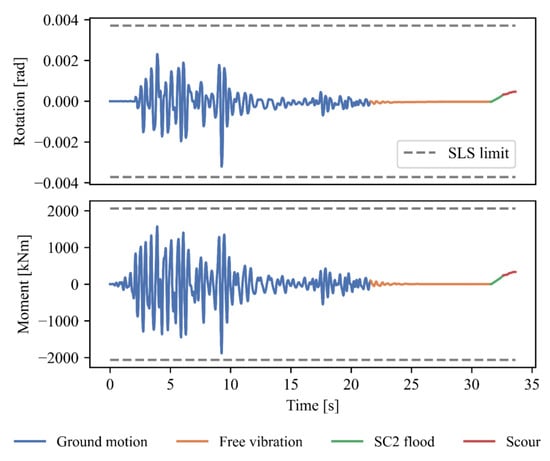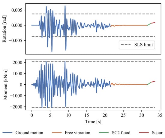 Following the GM event, the bridge was assumed to undergo free vibrations (orange line in Figure 6), letting the structure settle into a resting position. It should be noted that the bridge may experience permanent deformation and may not return to its original position. Therefore, its loading and unloading stiffness might be reduced.