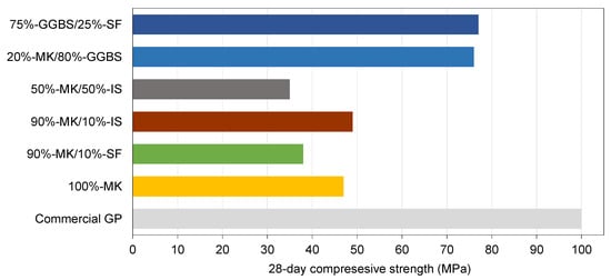 The 28-day compressive strength results for the geopolymer mixes considered.