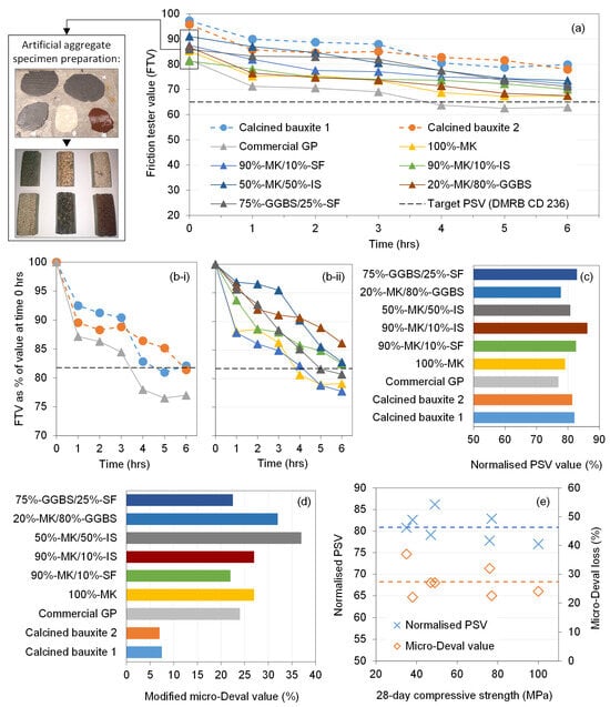 (a) Raw friction tester values (FTV) obtained from PSV testing; (b) FTVs as a percentage of original values at time 0 h for (i) control mixes and (ii) experimental geopolymer mixes; (c) percentage FTV value losses from 0 to 6 h; (d) percentage modified micro-Deval losses, and (e) relationships between 28-day strength and micro-Deval and FTV losses.