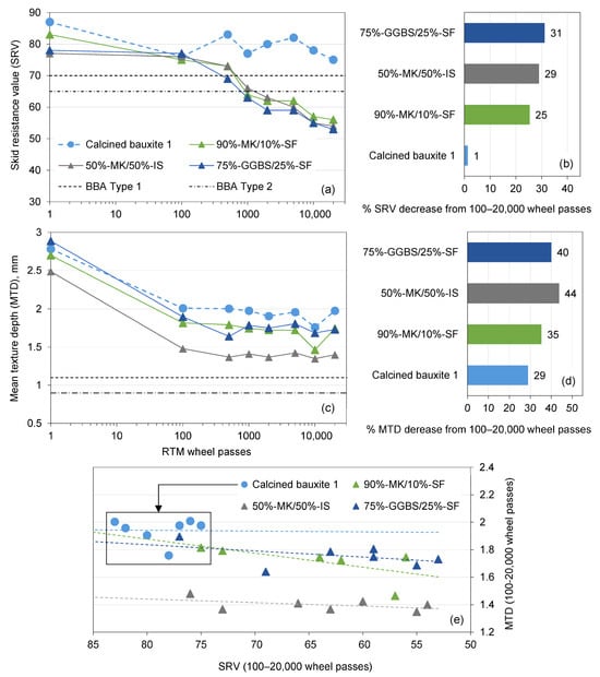 The differences in relative performance for the SRV and MTD values is further highlighted in Figure 4e, which plots the relationship between the two data sets from 100 to 20,000-wheel passes. Clearly, SRV reductions were more significant than those for the MTD values. Also apparent from this figure is the superior performance of the calcined bauxite control specimens (highlighted by the bounding box added) relative to those with the artificial geopolymer aggregate.