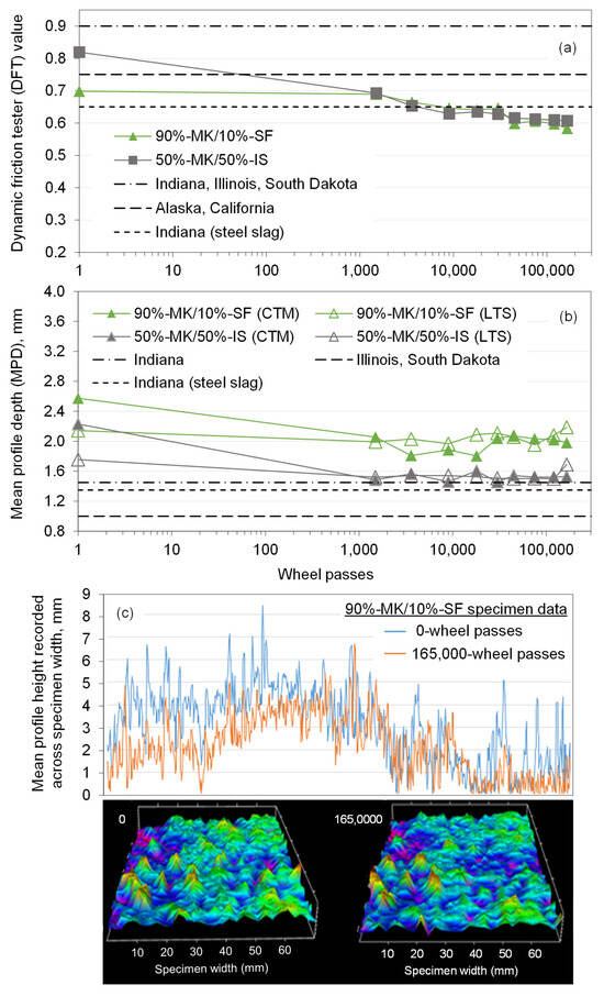 Based on the results presented in Figure 4, specimens using the 90%-MK/10%-SF and 50%-MK/50%-IS geopolymer aggregates were selected for further investigation. Simulated wearing was carried out according to US methods using the CTPM at INDOT. Skid resistance and texture depth results were measured after 1500, 3600, 9000, 18,000, 30,000, 45,000, 75,000, 120,000 and 165,000-wheel passes. Skid resistance results recorded using the DFT method and texture depth results recorded using both the CTM and LTS methods are plotted in Figure 4. Recommended target values prescribed by various US departments for transportation (Indiana, Illinois, South Dakota, Alaska and California) for calcined bauxite-based HFS are included in the figure for context. Based on research undertaken by INDOT [32], targets for steel slag-based HFS are also included (i.e., DFT and MPD values of 0.650 and 1.35 mm, respectively).