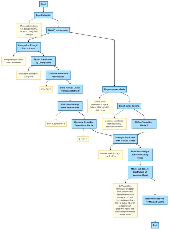 This integrated approach uses Markov Chain modeling and regression analysis to predict concrete compressive strength evolution across mix compositions and curing intervals. Data are collected and preprocessed, strengths are categorized into discrete states, and transition probabilities capture progression. Regression analysis refines the Markov model, enabling accurate forecasting and supporting optimal mix and curing decisions. The overall methodology is depicted in the flowchart (Figure 1).