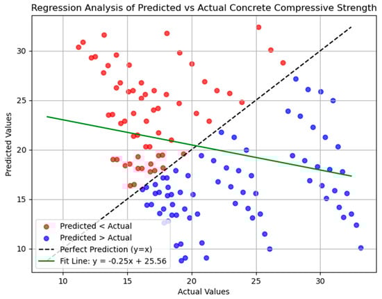 Model validation was performed by directly comparing the predicted compressive strength values against the experimentally measured data for all concrete mixtures and curing intervals. In this study, the entire dataset was utilized for both model development and validation, as illustrated in Figure 1. This approach was chosen to maximize the robustness of parameter estimation, given the available sample size and the variability across mixtures and curing times. The predictive performance of both the regression and Markov Chain models was evaluated using statistical metrics, including coefficient of determination (R2), root mean square error (RMSE), and standard error. These metrics provide a quantitative assessment of the goodness of fit and the accuracy of the models in forecasting concrete compressive strength throughout the full range of experimental conditions. Graphical analysis, such as scatter plots and regression lines, further illustrate the relationship between predicted and actual values, supporting the reliability and interpretability of the modeling approach.